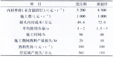 以產(chǎn)量5 000 t的四代篦冷機(jī)來說,替換使用預(yù)制件的部位澆注料用量按80 t計(jì),每噸澆注料大約要用0.023 t的0Cr25Ni20耐熱鋼錨固釘。耐熱鋼錨固釘單價(jià)若按5萬元·t-1計(jì)算,則在篦冷機(jī)上使用澆注料與預(yù)制件的比較結(jié)果見表1。