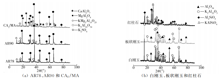 1300℃×5h條件下不同試樣與堿鹽反應后的的XRD圖譜如圖2所示。由圖2中可看出,AR78和AR90與堿鹽反應生成鉀β-Al2O3(K2O·11Al2O3)、KMg2Al15O25和K2SO4,CA2/MA與堿鹽反應生成鉀β-Al2O3和KMg2A15O25,其生成物相衍射峰強度低,表明材料與堿鹽反應程度小,所引起的體積膨脹較小。這是由于實驗選用的尖晶石均為富鋁尖晶石,其在固溶Al2O3時發生了3Mg2+—2Al3+非等價置換,結果導致晶面間距和晶格常數減小,使尖晶石材料結構致密,從而能有效抑制堿鹽的滲透和侵蝕。白剛玉和板狀剛玉與堿鹽反應生成K2O·11Al2O3,紅柱石與堿鹽反應生成KAlSiO4和AlO3,其生成物的衍射峰強度較高。這是由于與堿鹽反應生成的新礦物相密度小于耐火材料原始相密度,從而引起較大的體積膨脹。對應于表1中較大線變化率的試樣,其材料抗堿性能較差。