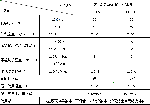 適用于大中型新型干法水泥窯預(yù)熱器下料斜坡、上升煙道、分解爐錐體,煙室,四、五級預(yù)熱器錐段、下料管等易結(jié)皮部位。碳化硅抗結(jié)皮澆注料主要以碳化硅為主要原料,添加高效減水劑與超微粉,以純鋁酸鈣水泥做結(jié)合劑,可以大幅度降低結(jié)皮次數(shù)。